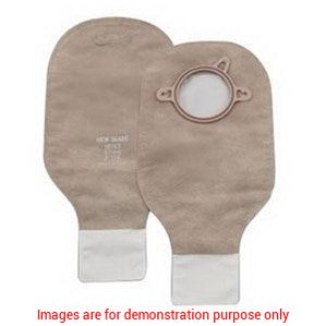 Contains a box of 10 New Image Clamp Closure 12" drainable beige pouches with a filter and a 2-1/4" flange. These pouches offer secure closure, efficient drainage, and discreet wear for superior stoma care.